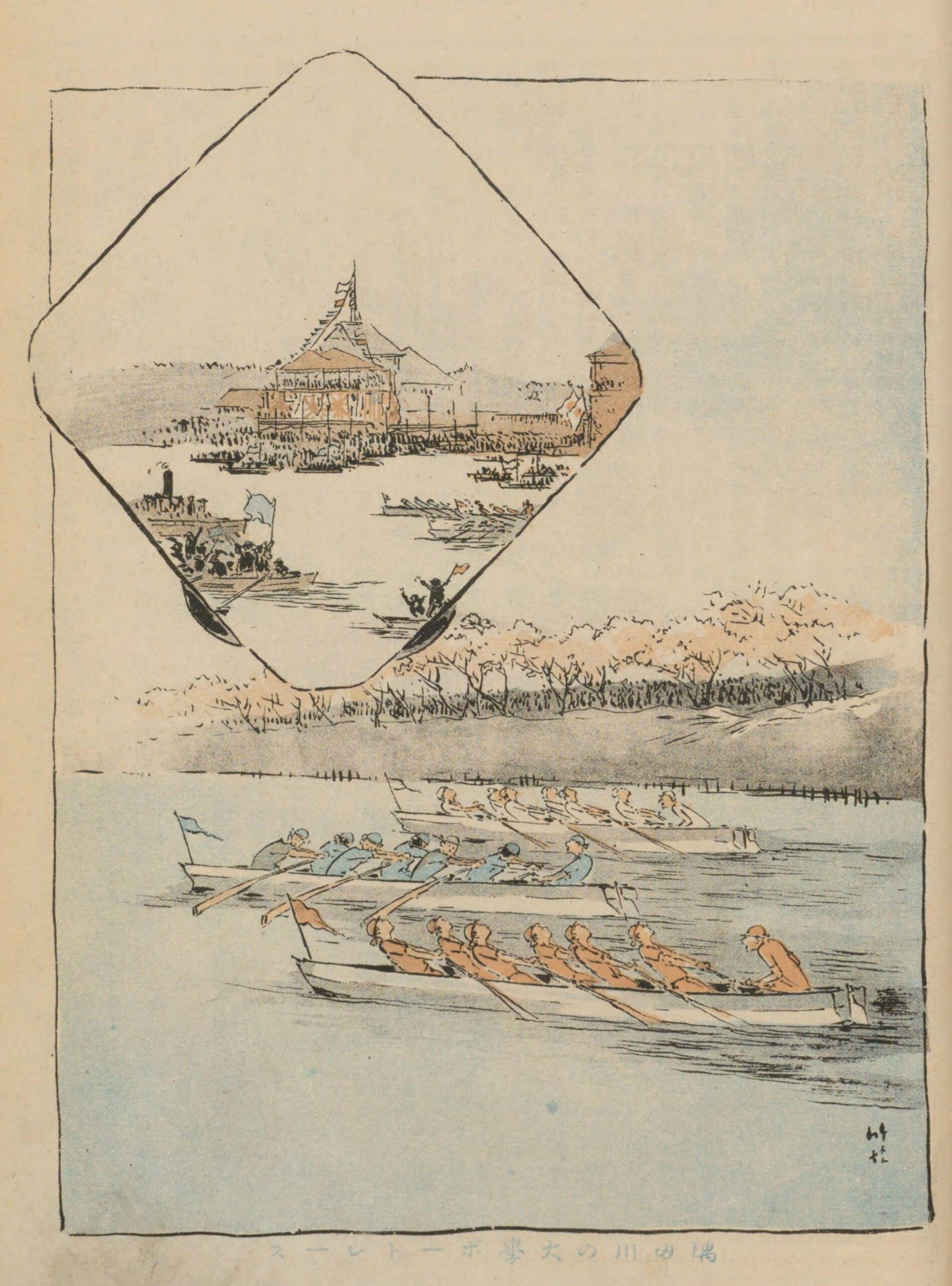 ボートレース 2025年10月8日 ・多くは桜の盛りの四月に開催される大学・企業・団体による対抗レース。・東京では隅田川の早慶レガッタ、関西では琵琶湖瀬田川での競漕が有名。読みぼーとれーす分類生活音数6 尾竹竹坡『世事画報 2』端艇競漕 ぼーとれーす