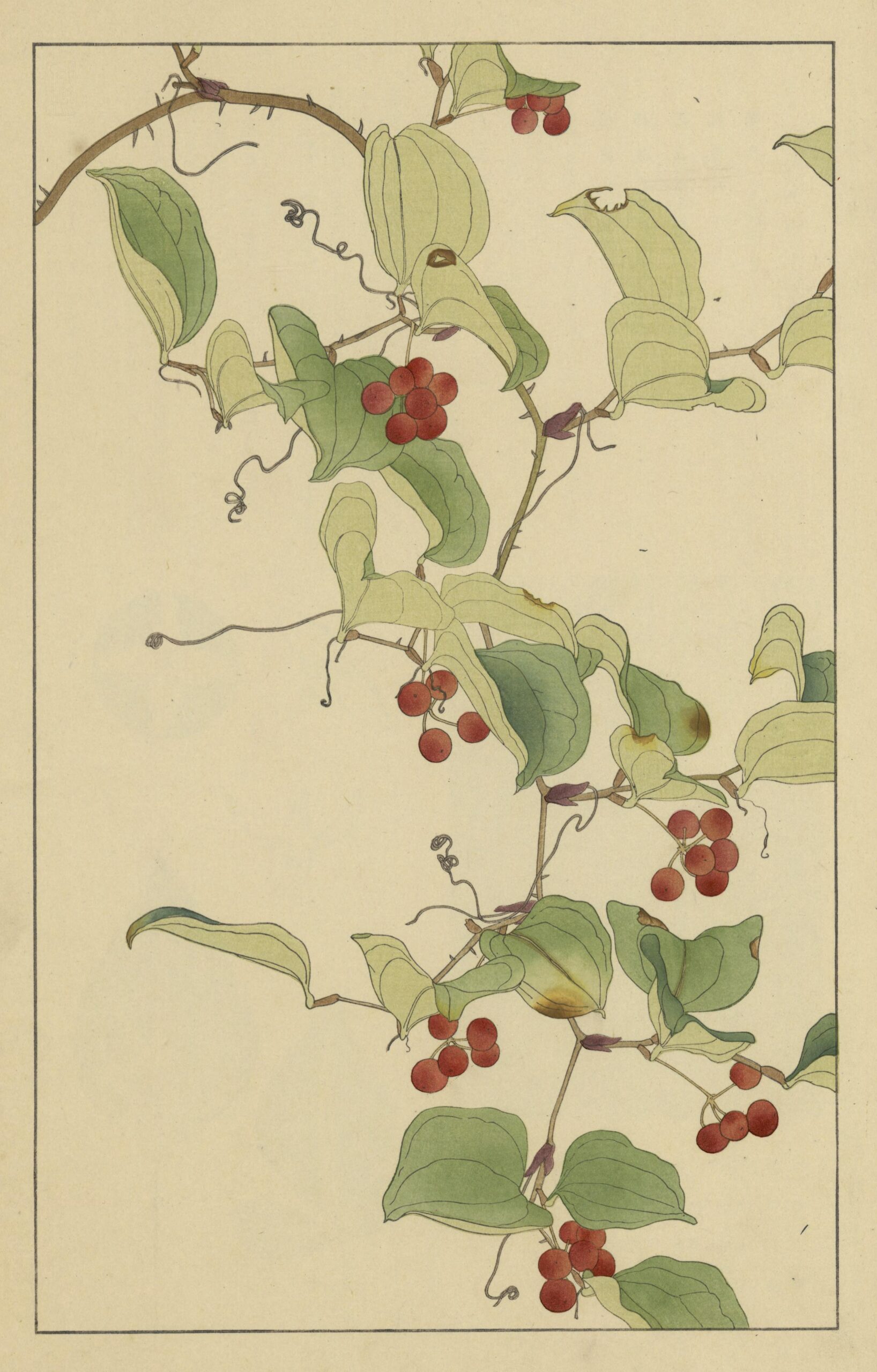 山帰来の花 2025年10月8日 ・日本で一般に山帰来と呼ばれるのは、猿捕茨(さるとりいばら)で、ユリ科の蔓性落葉低木。・山野に自生し、棘が多い。・晩春には黄緑色の小花を多数、散形に咲かせる。・本来の山帰来は日本には自生せず、台湾や中国南部に分布する熱帯植物である。読みさんきらいのはな分類植物音数8 杉浦非水『非水百花譜』さるとりいばら さんきらいのはな