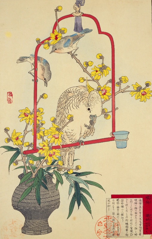 蠟梅 2025年10月8日 ・ロウバイ科の落葉低木。・中国原産で「唐梅」とも呼ばれる。・一〜二月に香りの良い黄色い花を咲かせる。・臘月(旧暦十二月)に咲くことから「臘梅」とも書く。読みろうばい分類植物音数4 楳嶺花鳥画譜_蝋梅・鸚鵡 ろうばい