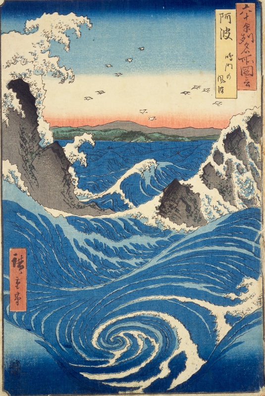 観潮 2025年10月8日 ・淡路島と四国の間にある鳴門海峡は、大小の岩礁が点在し、潮流が速いため、干満によって潮の渦が生じる。・これが鳴門の渦潮であり、旧暦三月三日前後の大潮の頃が見頃となる。読みかんちょう分類生活音数4 歌川広重『六十余州名所図会』阿波 鳴門の風波 かんちょう