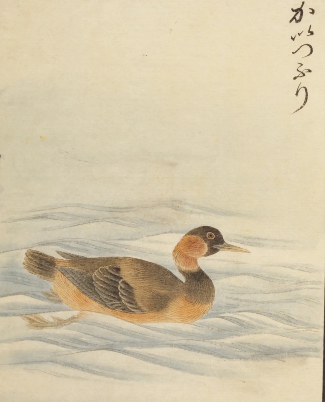 鳰 2025年10月8日 ・カイツブリ科の水鳥。・鳩よりやや小さく、水中に潜って魚を捕る。・鳴き声は「キリツ、キリリリ」など美しい。・冬の池沼でよく見られる。読みかいつぶり分類動物音数5 華鳥譜_かいつふり かいつぶり